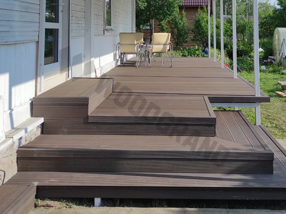 Мы довольны открытой террасой к дому из ДПК, нам теперь реально по-доброму завидуют. Сама текстура террасной доски очень приятная, нравится ходить голыми ногами, просто на ней сидеть, при попадании дождя быстро высыхает. Забыли при заказе взять образцы, все спрашивают. Грязь собирается в углублениях, но она легко выметается.